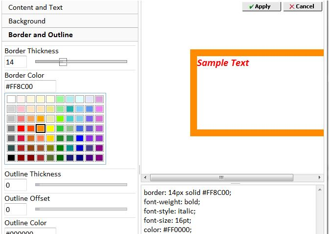 - To modify another style parameter, click on the appropriate tab. The options displayed will change to reflect those available for the given selection. For example, selecting Border and Outline will present the following options: