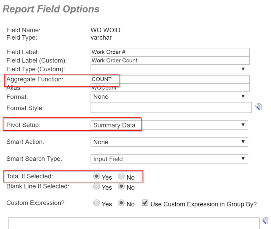 - Highlight the third field in the Display Fields List (WO Count) and click Edit to access the Report Field Options dialog for this field. This will be the defined summary calculation for this pivot report: