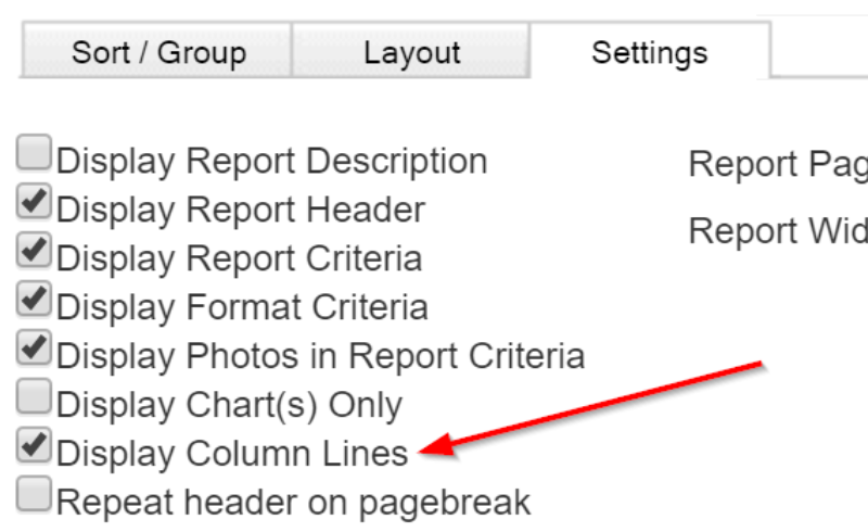 Tip: Some customers like to use the "Display Column Lines" indicator on the General>Settings sub-tab to display the report in a grid: